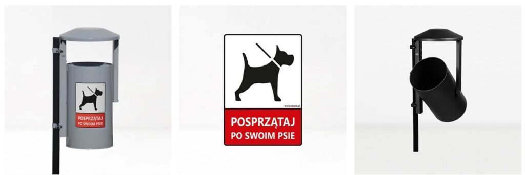 - Kosze miejskie – montowane na ulicach, w parkach i na placach. Często wyposażone w popielniczki oraz daszki chroniące przed deszczem.